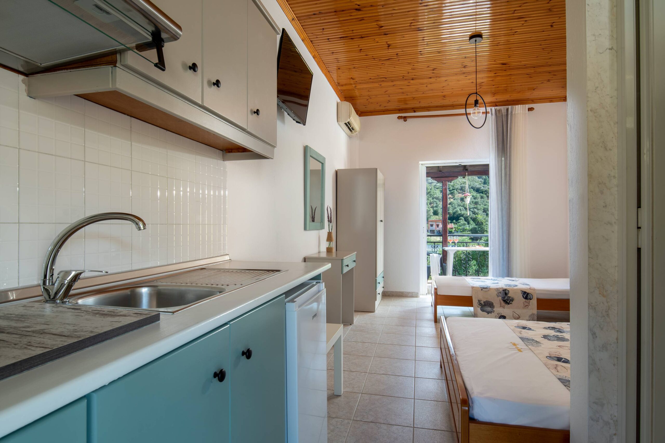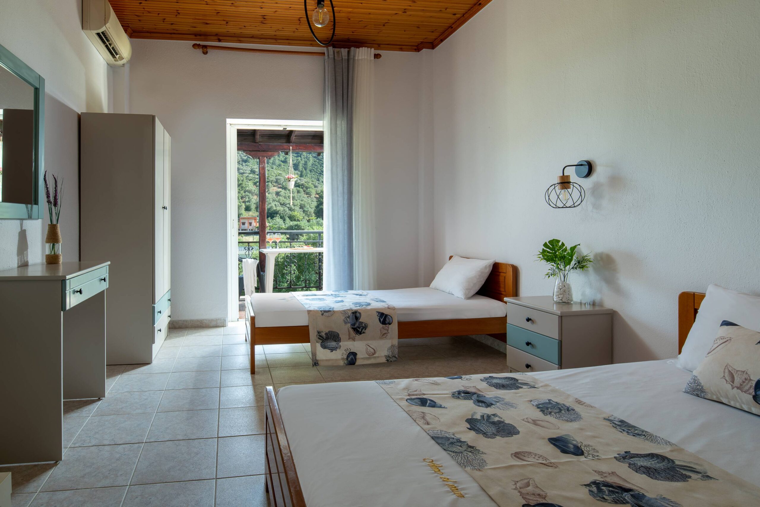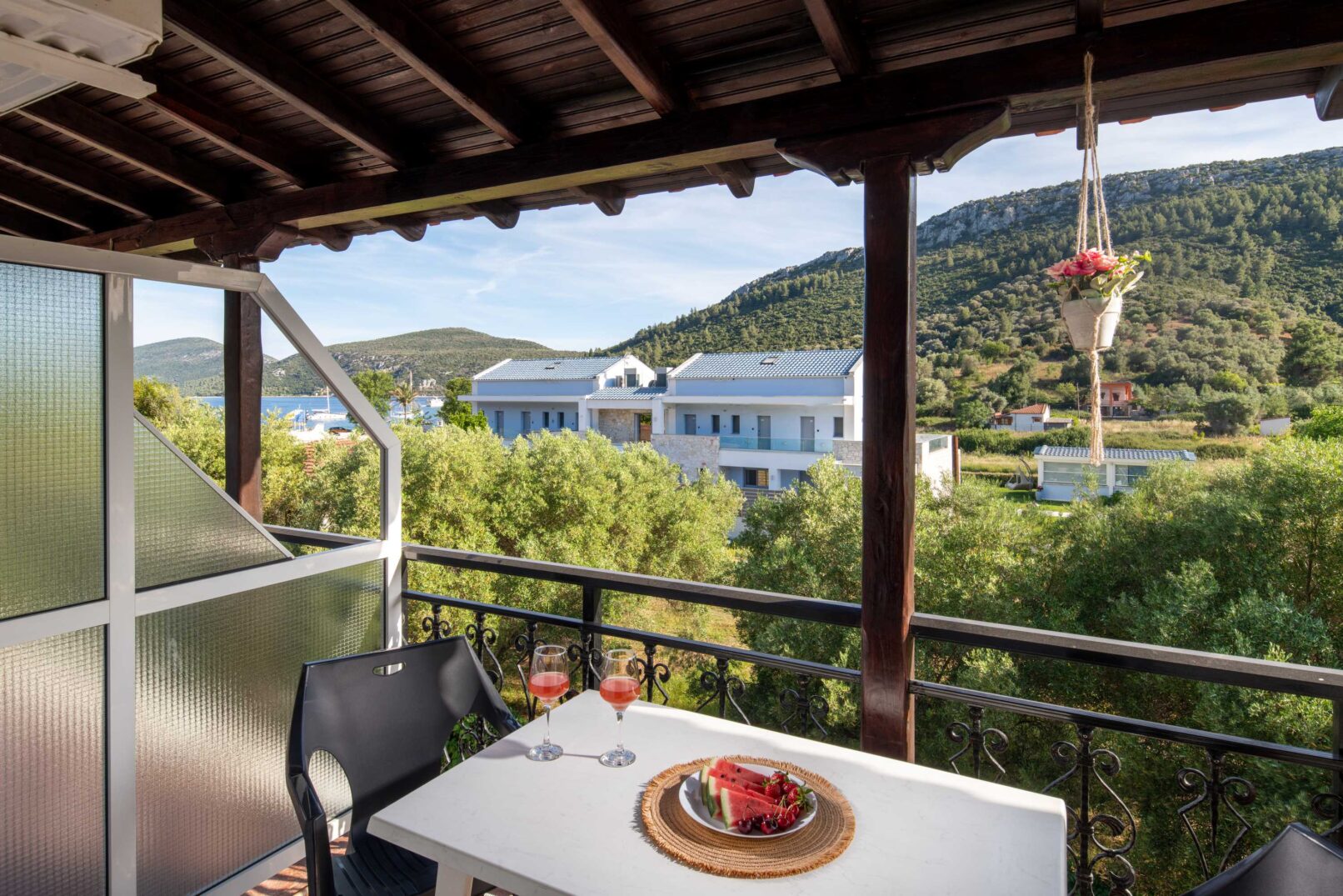 Κάθε δωμάτιο έχει ιδιωτική βεράντα με θέα στο λιμάνι του Πόρτο Κουφό .