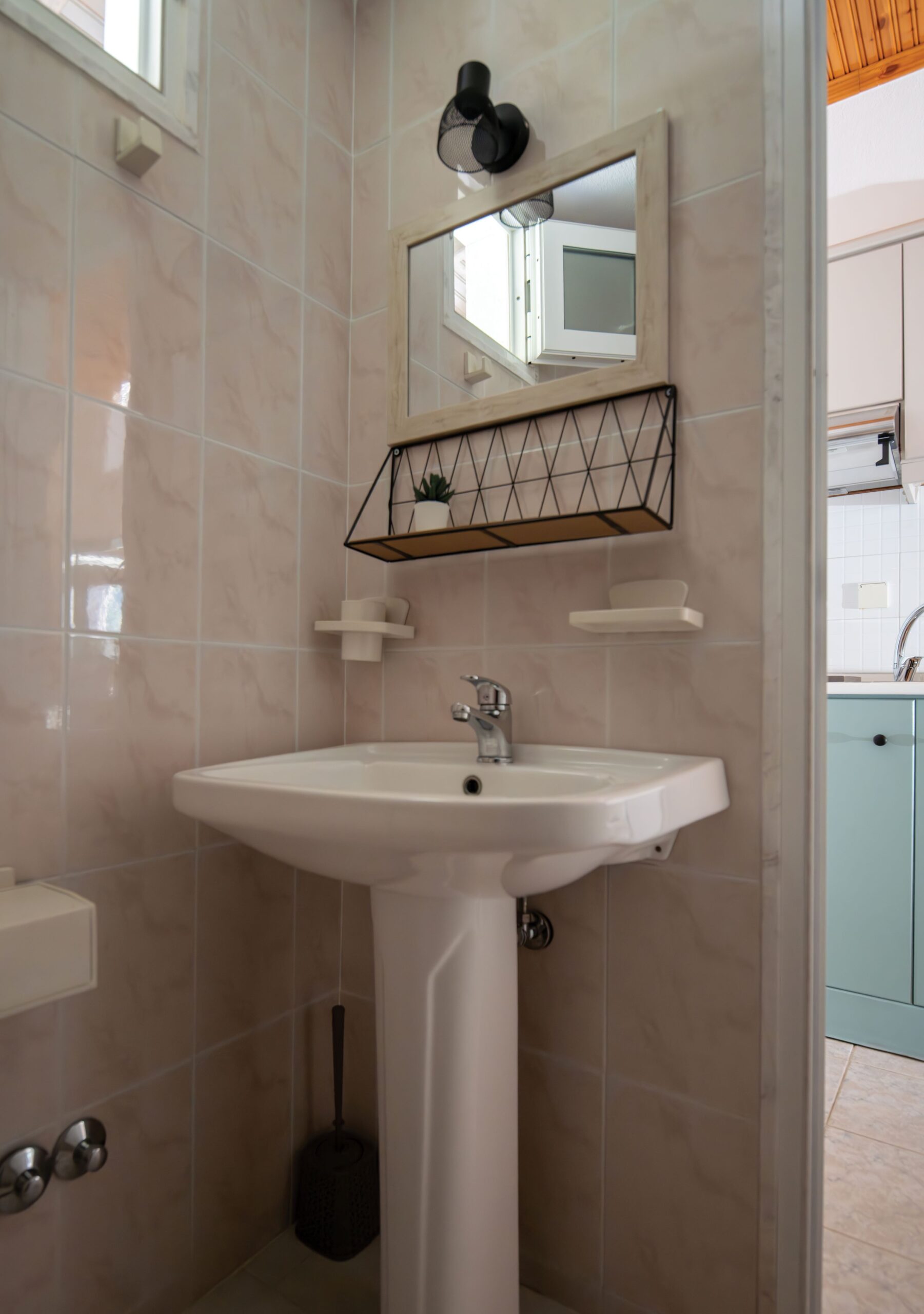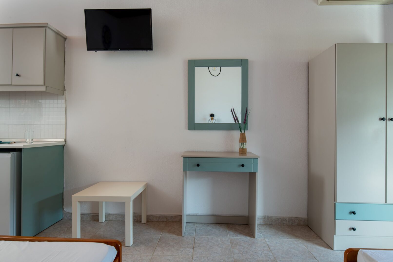 Κομψό και άνετο δωμάτιο με ένα διπλό και ένα μονό κρεβάτι με πουπουλένια μαξιλάρια, vintage εξοπλισμένη κουζίνα με μαγειρικές εστίες και ψυγείο, μπάνιο με ντους, ντουλάπα και boudoir με καθρέπτη.